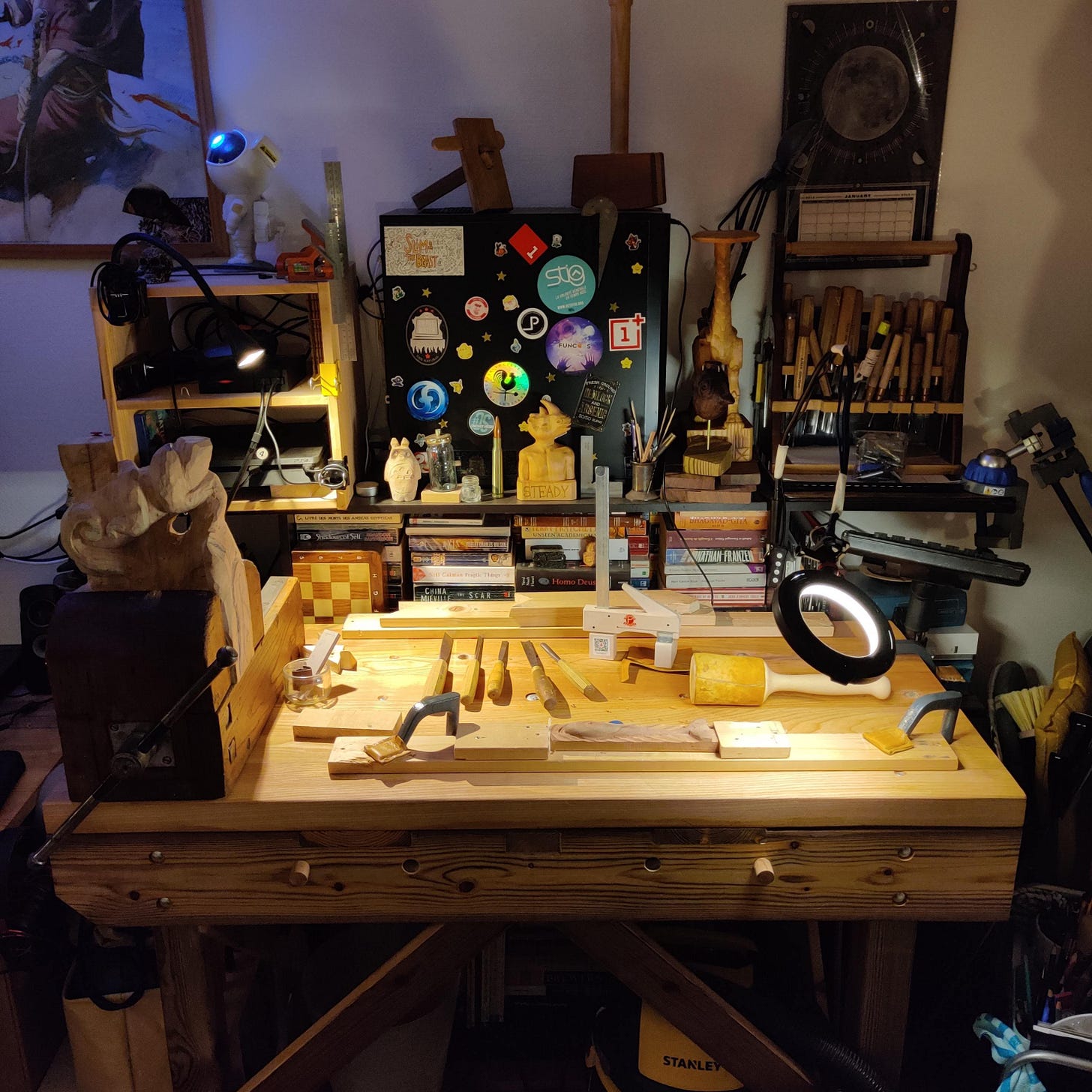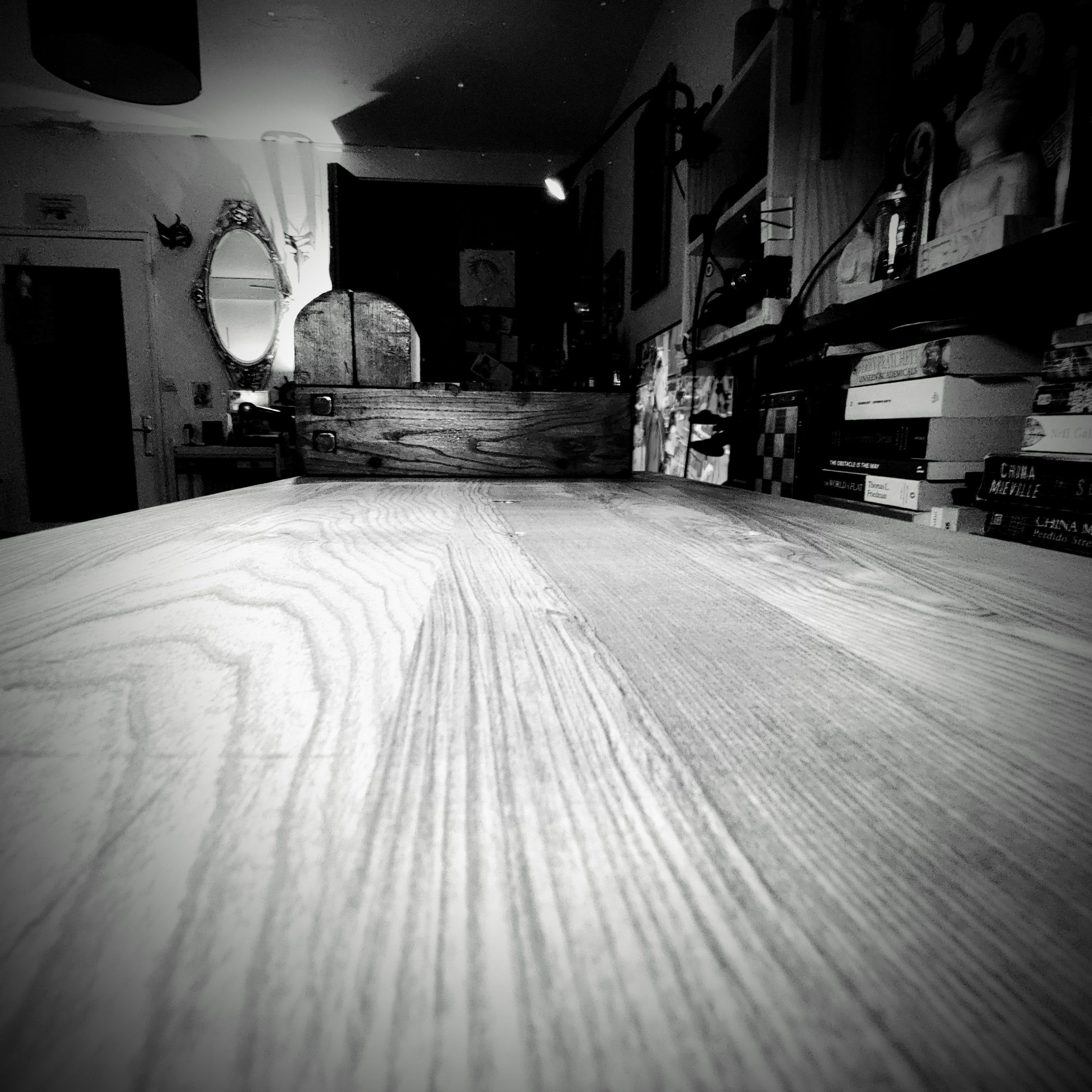 I have a workbench in my room I built myself when my brother was still alive The bench-top is a 5cm-thick slab of beechwood harvested in the mountains of Ardèche given to me as a gift by my old friend Ben I also have a giant TV in my room which is by a wide margin the window I look out the most Mostly I do woodwork at my workbench sometimes leatherwork or glass brass and copper inlay or Yoga clinging to the dogholes to sit deep into my hamstrings like an invisible chair pulling my vertebrae apart as far as they will go Sometimes it's waterworks like when this stupid song starts playing Running up that hill by Kate Bush out of nowhere in a random episode of Stranger Things A song I never paid no mind When I hear "if I only could I'd make a deal with God and I'd get him to swap our places" I need to pause the episode because I don't want to remember this as the time I sat there crying about a teenage sci-fi show I clear a space on my workbench as if to place my sadness upon it like a surgical patient The grief comes out of the walls the floor the PC speaker set given to me as a gift by my old friend Sid the Netflix window with Stranger Things on pause the Kate Bush song playing on Spotify over and over lyrics I'm really hearing for the first time that have little to do with what I'm going through except for that one simple line Tracing my steps to locate the source of the grief asking the patient where it hurts I know my brother used to like the song the TV show and being alive Sometimes that's all it takes I place my fists on the beechwood top mirroring each other as they open and close contract and release like the two lungs of my surgical patient like two bean-shaped kidneys like two cervical vertebrae and the space between them My tears darken the pale wood in perfect circles the perfect cone of light between my hands the slab brought down from the mountain the countless nicks and scrapes dents and gouges the fingerprints of screw-heads and drill-bits palm-prints of sky-blue water stain from all the work I have done so far Staring into the grain like an oracle wondering how much is left to be done How many breathing exercises How many declined invitations to leave the house How many of these stupid poems I flip open the battered royal blue notebook given to me as a gift by my lover Amanda smooth down a clean white page and let the wood do its work and let the water do its work